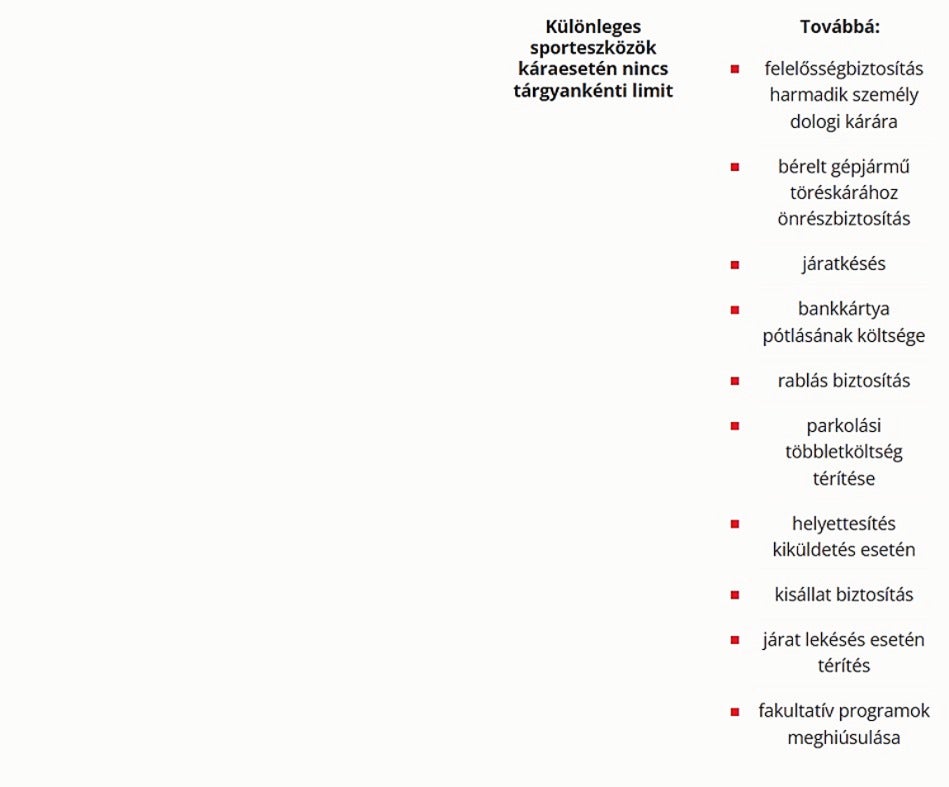 Amatőr jelleggel végzett kijelölt pályán történő síelés, sífutás, monosíelés, snowboardozás, síugrás, szánkózás, korcsolyázás, jégvitorlázás, hórafting, valamint szakképzett kísérővel vezetett túra keretében a snowmobilozás (motoros szánozás), via ferrata, búvárkodás (legfeljebb 40 méteres mélységig), kitesurf, quadozás, felségvizeken történő vitorlázás (kivéve, ha abban a Biztosított a legénység szerződött tagjaként vesz részt), mélytengeri horgászat, rafting, canyoning, hydrospeed, evezés, vívás, íjászat, lovaglás, görkorcsolyázás és gördeszkázás, golf.